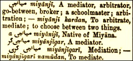 मियां शब्द में जो मध्य या बीच का भाव है वह फारसी के दरमियां (दरमियान, दरम्यान, दर्म्यान) में भी स्पष्ट हो रहा है। फारसी के दर उपसर्ग में ‘ के भीतर’, ‘अन्दर’, ‘शामिल’ जैसे भाव हैं। दर–मियान में सापेक्ष भाव है जिसका अर्थ हुआ ‘के बीच में’, इसके अलावा इसमें मध्यम, मंझौला, औसत जैसा भाव भी शामिल है जैसे दरमियाना क़द। किन्ही दो बिन्दुओं के बीच की स्थिति बताने के लिए दरमियान शब्द का प्रयोग होता है। मियान में बीच का भाव पोले, चौड़े और खाली स्थान के अर्थ में और खुला। इसमें कोश, भंडार, गोदाम का भाव शामिल हो गया। पुरानी शैली के मकानों में दो मंजिलों के बीच एक छुपा हुआ कक्ष भी बनाया जाता था जिसे मियानी कहते थे। दरअसल फारसी के मियांसरा शब्द से मियानी निकला है। मियांसरा का अर्थ होता है महल (सरा, सराय) के बीचोंबीच का स्थान। सलवार या पायजामा जैसे वस्त्रों में दोनों पाँयचों को जोड़ने वाले कपड़े को भी मियानी ही कहते हैं क्योंकि इसकी स्थिति बीचोंबीच रहती है। तलवार रखने की जगह म्यान कहलाती है जो इसी मूल से उपजा शब्द है।